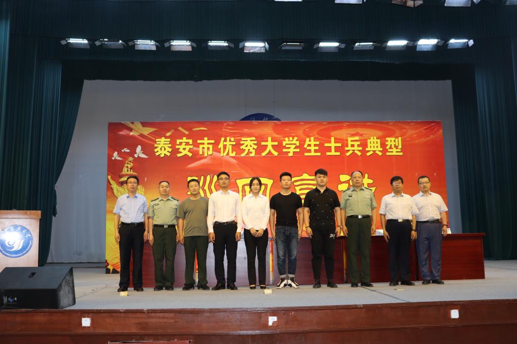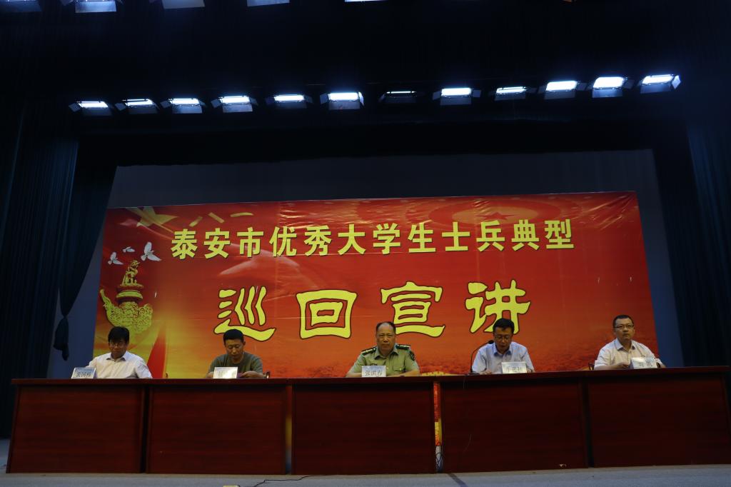 5月31日下午,泰安市驻泰高校优秀大学生士兵典型巡回宣讲会在西校园礼堂举行,岱岳区人武部军事科科长张洪春,岱岳区人武部政工科科长赵刚,信息系党总支副书记、副主任裴国栋,经管系党总支副书记、副主任刘凯以及以及学生代表近1000人参加了报告会,报告会由学生处副处长牛进社主持。