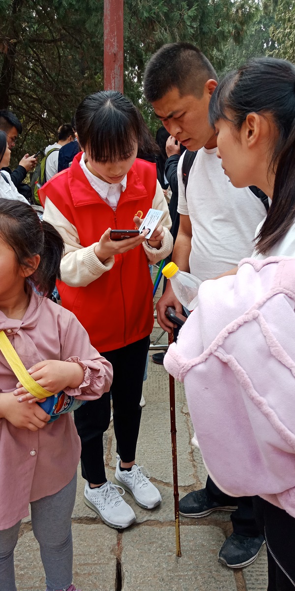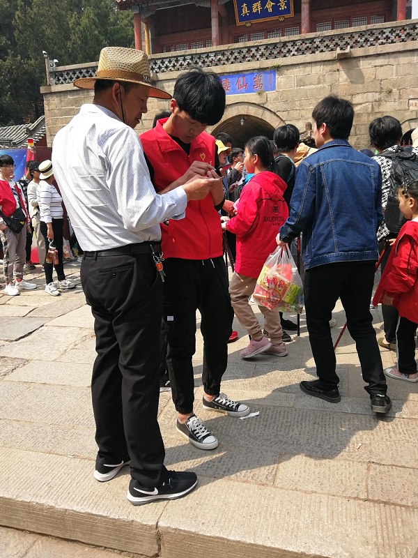 本次清明节假期,恰逢“三月三”,并且随着天气转暖,泰山客流量增加,校区志愿者联合会对此详细安排活动任务、细化人员分工,分别在红门路岱宗坊路口开展“黄网格”志愿服务、在泰山万仙楼开展“青未了”志愿服务。