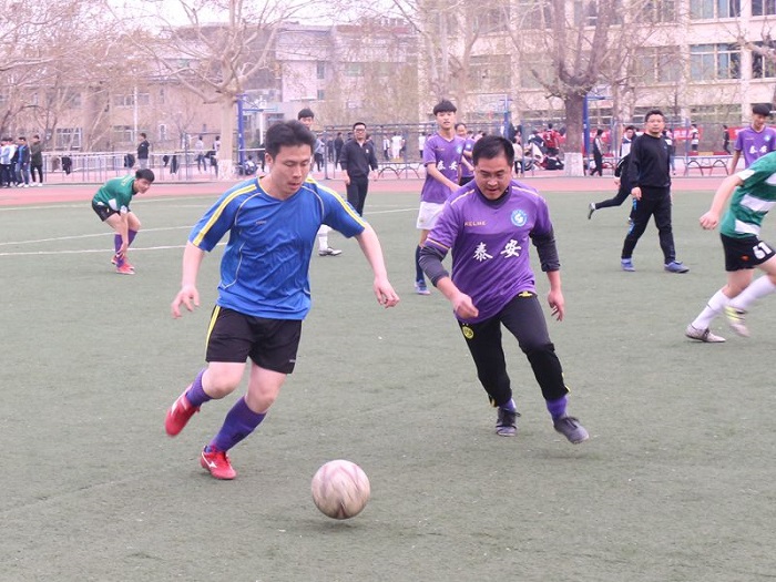 下午4点10分,师生友谊赛正式开始。本次比赛的两支参赛队伍分别由东、西校园的老师和学生组成。足球场上,师生配合默契,主动进攻,积极防守,大家都集中注意力,紧盯足球,球员们为每一次射门而高声呼喊,也为每一次精彩配合不断鼓掌加油。师生们的积极互动也引起场外观众们热情的呐喊,一阵阵的加油喝彩声更加激发了球员们的斗志。在一次次的配合下,西校师生队员率先进攻赢得先机,获得了上半场的胜利,下半场东校师生队员也不甘示弱,抓住机会,凭借默契的配合扳平了比分。紧张的比赛对每一位运动员的体力都是极大的考验,尽管汗水浸透了球衣,但大家依然积极拼搏,努力奔跑,最终西校师生代表队取得了胜利。