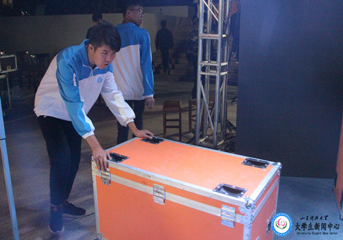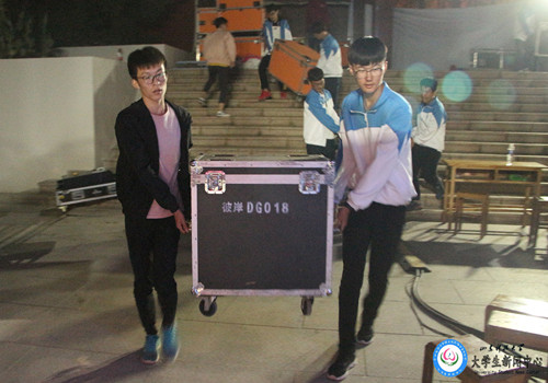 晚会开始前,学生会各工作人员在夜色中进行舞台搭建、设备安装、器材调试。为达到最好的表演观赏效果,后台工作人员坚守设备,目不转睛的调试音响,细致入微旋、默契有度的配合,赢得了同学们的一致好评。