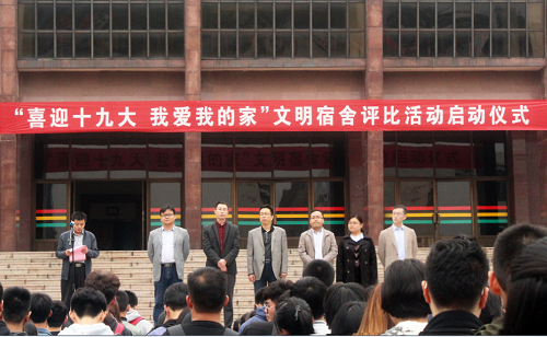 10月11日,校区、学院“喜迎十九大,我爱我的家”文明宿舍评比活动启动仪式在西校园礼堂前举行。校区、学院学生处副处长牛进社、各系团总支书记、辅导员出席启动仪式。启动仪式由学生处教室管理中心主任宋明永主持。