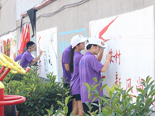 “中国梦”、“家和万事兴”、“新农村 新风尚”……一幅幅绘画作品穿插在朱前村的大街小巷,积极倡导着社会主义核心价值观、中国梦等中华民族传统文化。在作画过程中,队员们的工作也不断引来村民的驻足观赏,村民们在百忙之中为同学们送来西瓜、矿泉水,为烈日下队员们送来一丝清凉。