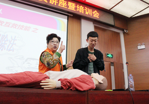 泰安市红十字服务部主任李青等为同学们介绍了近几年来,由于自保和急救意识的缺乏而导致的多起事故。以上海外滩踩踏事故为例,重点强调了自保和急救知识的重要性。通过列举多个自救成功的案例,进一步说明了掌握急救知识在日常生活中的必要性,重点强调了指压止血法和徒手心脏复苏法的动作要领。培训过程中,讲解员亲自为同学们示范自救的规范动作,并邀请同学们亲自上台体验,与同学们积极互动。