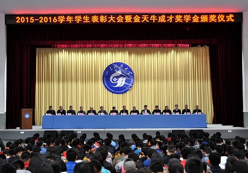 12月6日,校区、学院2015—2016学年学生先进集体先进个人表彰大会暨“金天牛成才奖学金”颁奖仪式在东校园礼堂隆重召开。副校长王少鹏,山东金天牛矿山机械有限公司董事长牛之平,校区学院负责人刘传玺、苏同营、王民、贾长响、耿献文、逄杰文及相关部门、各系负责人出席了表彰大会。大会由学生工作处处长黄德杰主持。