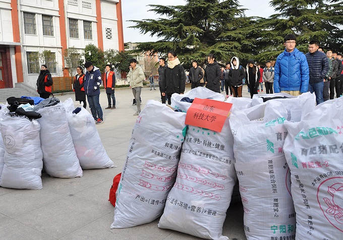 11月24日,由校区、学院团委主办,大学生志愿者联合会承办,山东农业大学阳光志愿者协会、山东财经大学东方学院财政金融系社团服务部协办,以“旧衣一份,‘衣’旧情深”为主题的,驻泰高校志愿者首届旧衣捐赠仪式在文化广场圆满落幕。校区、学院团委书记王靖磊,副书记朱庆豪,泰安市慈善总会郭启建和部分驻泰高校志愿者代表参与了本次活动,仪式由校区、学院团委社会实践部部长王衍国主持。