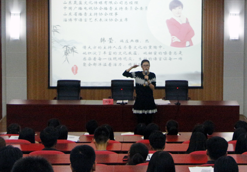 10月27日晚,西校园八角楼报告厅举办了以“语言表达存在的问题”为题的报告会,中央人民广播电台播音指导、《新闻和报纸摘要节目》《全国新闻联播》主播陆洋和北京电台培训中心山东培训总部主任韩莹作为本次主讲,校区、学院团委副书记朱庆豪主持了本次报告。