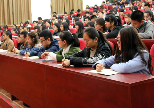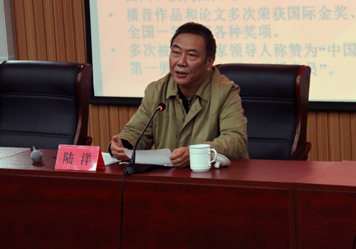 报告伊始,陆洋教授通过语言作为中华文明的载体,对于民族发展和文化传承具有不可小觑的作用引申到语言教学的重要性和当代社会各类语言类学校的不规范现象。继而通过2008年美国次贷危机和日本大地震引发的新闻舆论强调了正面消息对于人民群众的凝聚作用和对社会的促进作用,并且指出新闻内容要“以正面宣传报道为主,以针砭时弊为辅”。在报告进行过程中,陆洋教授的散文朗诵情绪饱满、抑扬顿挫,新闻播报字正腔圆、铿锵有力,为同学和老师们带来了一场视听盛宴,引得同学们连声叫好,掌声不断。陆洋教授通过不同的语言样式表现出了语言的魅力和语言对社会和人们的影响。之后,韩莹主任现场为同学们表演了婚礼、车展、寿宴和开业典礼等不同场合下的语言表现形式,温文尔雅、彬彬有礼的表演令同学们大饱眼福。同时韩主任通过自身的亲身经历和切身体验激励同学们奋发向上、有所作为,并且鼓励同学们勇于尝试新鲜事物,进行创业。