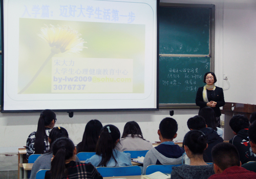 此次讲座由文法系宋大力老师主讲。讲座伊始,宋老师以东校一名学生的事例为切入点,讲述了心理健康的重要性,提出了大学生心理适应调适的五个建议:调整心态,接受现实;重建人生目标;学习的适应;人际关系的适应和学会自我管理的适应。讲座围绕大学生生活和学习的各方面展开,宋老师为新生们提出了各方面的建议和要求,她指出:“人生中有六次转折,每次转折既是一次转变,也是一次成长。”讲座最后,宋老师为同学们推荐了“《心理访谈》我的大学系列”,希望同学们能够从中获益。讲座结束后,宋老师对同学们的疑问和困惑一一做出了解答。
