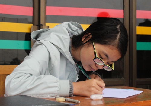 。礼堂前人来人往,同学们现场作画,优秀的漫画功底,娴熟的勾画