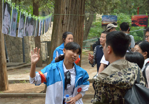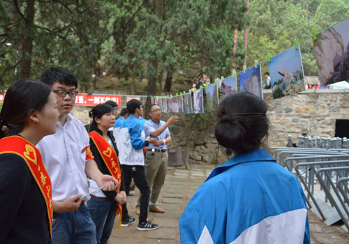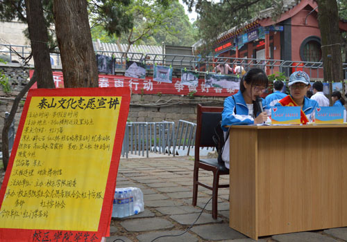 5月29日上午,校区、学院学生会志愿者联合会“红十字”志愿者,在红门票务站万仙楼附近试运作了泰山景点和泰山文化志愿宣讲活动。活动主要分为两个模块:一是通过设置咨询台,为游客解疑答惑;二是悬挂沿途景点KT板,志愿者们面向广大游客进行景点解说和泰山文化宣传。校区、学院团委社会实践部部长王衍国、泰山景区红门票务站书记吴海霞应邀体验了此项活动,并提出了改进意见和建议。
