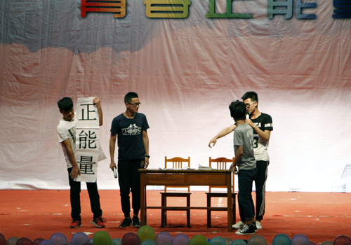 本次心理情景剧大赛以“青春正能量”为主题。经过各系的层层选拔和老师们的精心推送,共有6部心理情景剧突出重围并华丽上演,比赛选手们从大学生生活、学习、工作等方面着手准备,力求将自编、自导、自演的情景剧表演呈现给大家。比赛中,选手们将感情融入在角色中,用欢笑、泪水演绎着大学生的心理成长历程。他们的表演主题明确、内容新颖、场景转变跌宕起伏,受到了评委老师的一致好评。充满正能量的《上课啦》带观众们遨游大学课堂,饱含哲理引起观众共鸣。《墨镜墨镜告诉我》重现现实生活,告诫大学生要倾听自己的声音不要在意别人的眼光,要敢于摘下墨镜做真正的自己,将现场气氛引向高潮。最终,比赛在歌曲《相亲相爱》中完美落幕。