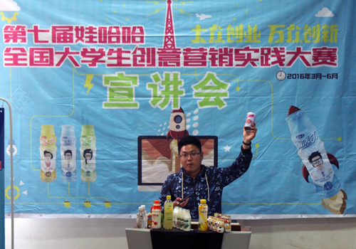 为提高当代大学生知识运用和实际营销能力,鼓励大学生积极地投身于创意营销实践中。4月8日,由校区(学院)团委主办,校区(学院)学生会承办的第一届娃哈哈全国大学生创意营销实践大赛于西校园1a107教室拉开帷幕。