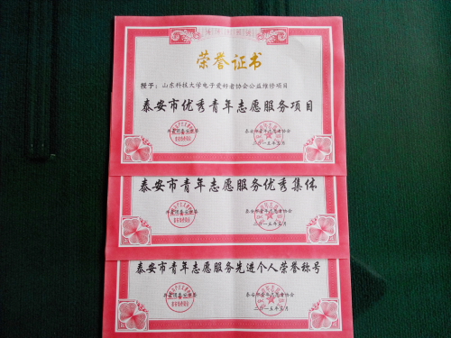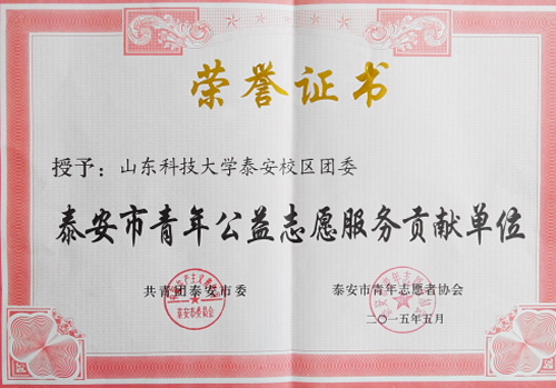 5月4日,在泰安市纪念“五四”运动96周年暨表彰大会上,校区团委、资土系团总支被授予“泰安市青年公益志愿服务贡献单位”,校区繁星青年志愿者协会、绿洲节能协会被授予“泰安市青年志愿服务优秀集体”,校区电子爱好者协会公益维修项目、繁星青年志愿者协会十一便民服务项目被授予“泰安市优秀青年志愿服务项目”,孙启瑾等8位同学被授予“泰安市青年志愿服务先进个人荣誉称号”。