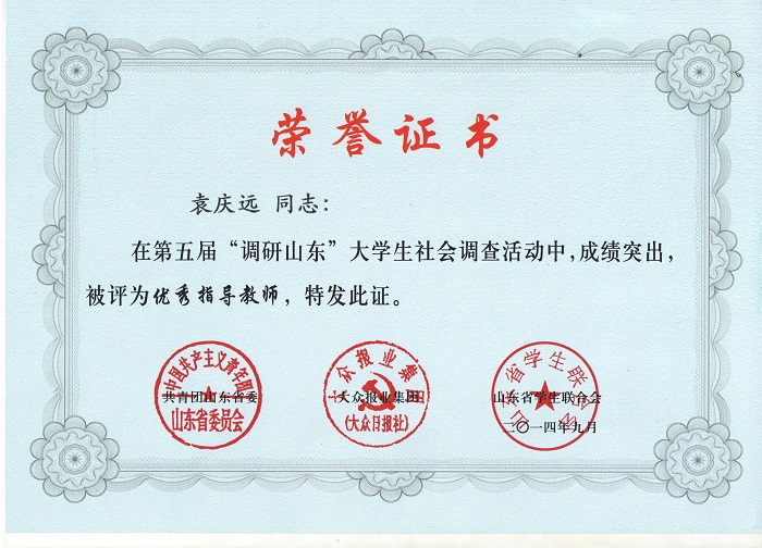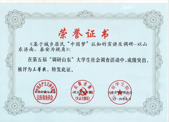 近日,团省委表彰了第五届“调研山东”大学生社会调查活动优秀组织单位、优秀指导教师和优秀调研成果,校区调研课题《基于城乡居民“中国梦”认知的宣讲及调研--以山东济南、泰安为视角》(作者:高嵩、卜泠玉、谢金松等,指导教师:袁庆远)获三等奖,袁庆远同志被评为优秀指导教师。