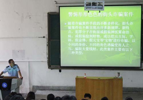 报告会上,秦警官围绕交通、消防及防盗三方面加以详细讲解,并现场播放了各种交通事故录像,让师生们真切感受到其强大危害。在消防方面,秦警官着重介绍了烟气在火灾中造成高致死的三大危险因素,即“有毒、高热、影响视线”。同时,他结合“逃生通道自救、结绳下滑自救、向外界求救”三救措施,告知大家在各个意外情况下所要实施的合理方法,劝诫同学们在日常生活中逐渐提高安全意识。最后,秦警官结合实例具体讲解防盗及识破各种诈骗的方法,让同学们受益匪浅。