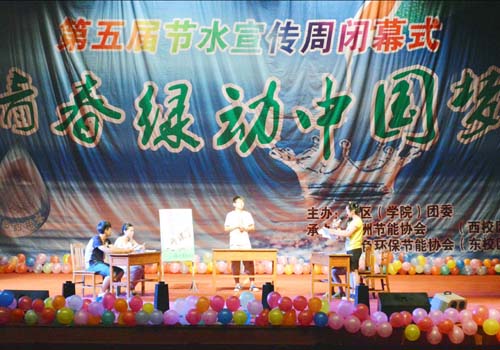 在第23个全国城市节约用水宣传周期间,为了进一步增强校园节水宣传的影响力,6月8日,由校区(学院)团委主办、绿洲节能协会与绿色环保节能协会联合承办的第五届节水宣传周闭幕式晚会在西校园礼堂成功上演。