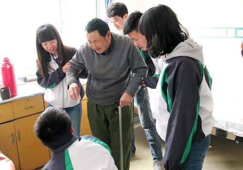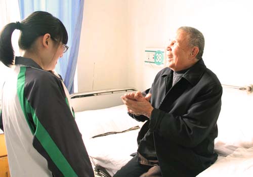 活动中,同学们每四人一组走进医院的各个病房内探望老人。宽敞明亮的房间布置、整齐化一的用品摆设以及护士们无微不至的照顾顿时温暖人心。对于学生们的到来,老人们心情激动不已,“我们身体很好,住在这儿也习惯,非常感谢党政府与院领导护士门的照顾!平日里看看电视、下下棋、说说话,或者坐上老年代步车去外面看看,生活很是方便,每天都很高兴!”与此同时,他们十分关心同学们的学习情况,并热切讲述早年战争场面以激励学生们努力学习,为社会做出贡献。同学们认真听取老人们的话语并不断点头微笑,现场气氛其乐融融。