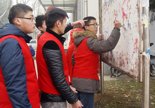 近日,校区(学院)自律会开展了校园小广告专项清理活动。活动中,大家齐心协力,不畏严寒,手持铁铲、清洁球、脸盆等清洁工具穿梭忙碌于校园小广告存在的区域。经过大家的共同努力,校园“牛皮癣”全部被清理干净,校园面貌焕然一新。