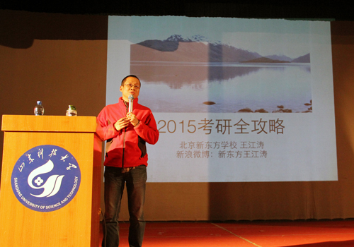 为了合理定位考研复习规划,给同学们提供专业的考研指导,11月5日,校区(学院)团委特邀“中国英语写作第一人”、北京新东方明星教师王江涛老师来校作题为“2015年考研复习规划和指导”的报告。