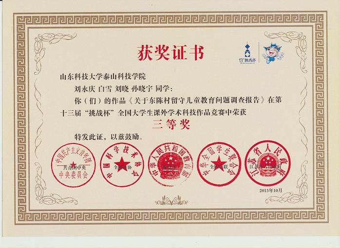 校区(学院)自2012年11月启动了校内选拔赛,共收到参赛作品55件,经过专家评审,选拔出7件作品参加第十三届“挑战杯”青岛银行山东省大学生课外学术科技作品竞赛,作品《关于东陈村留守儿童教育问题调查报告》获山东省特等奖,并入围全国决赛;另有一件作品《赢在未来:基于学龄前儿童入学、教育等实际问题的调查与探讨》(作者:袁丁、丁英杰、李亚茹、刘彦景,指导教师:袁庆远)获山东省三等奖,于华等四位老师荣获“优秀指导教师”称号。(文:朱庆豪)