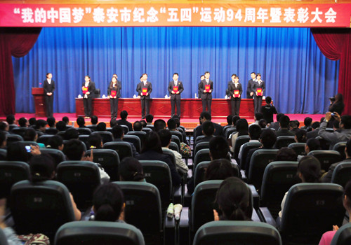 5月3日上午,泰安市举行“我的中国梦”纪念五四运动94周年暨表彰大会,市委副书记李琥,市人大常委会副主任孙运飞,市政协副主席、市总工会主席张书盈出席会议,会议由市委常委、副市长刘卫东主持。校区(学院)45名师生参加了表彰大会。
