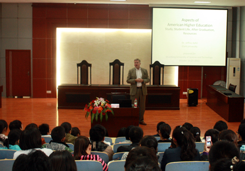 10月25日,美国克拉克大学Jeffery Apfel博士在西校园模拟法庭为校区(学院)师生作题为“美国大学生学习、生活及就业”的专题报告会。