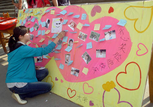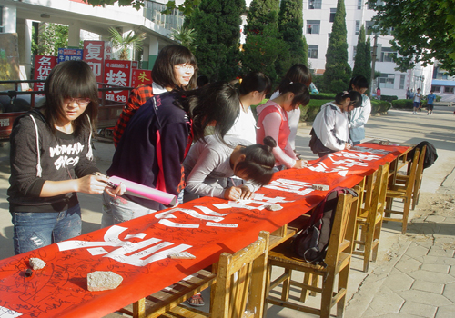 午后的礼堂广场上人山人海、热闹非凡,开幕式上阵阵欢声笑语引得同学们纷纷驻足并不由自主的参与其中。在工作人员的安排下,同学们纷纷在“拥抱生活,呵护心灵,感恩社会”横幅上签下自己的名字。并将他们写有自己愿望及祝福话语的彩色纸条贴于爱心展板上。而现场展示的“开心笑脸,喜迎校庆”主题原创漫画式笑脸则传达出大学生坦诚、乐观、健康的生活态度。此外,为进一步加强大学生对心理健康的重视,现场工作人员积极与同学们交流、探讨,分发心理健康知识传单,并和参与者互动拥抱。