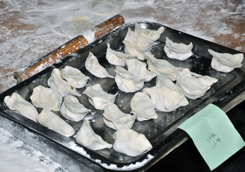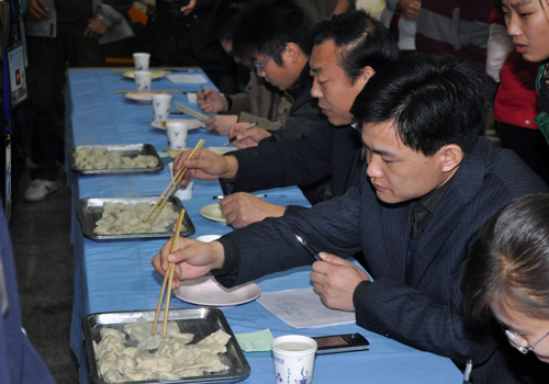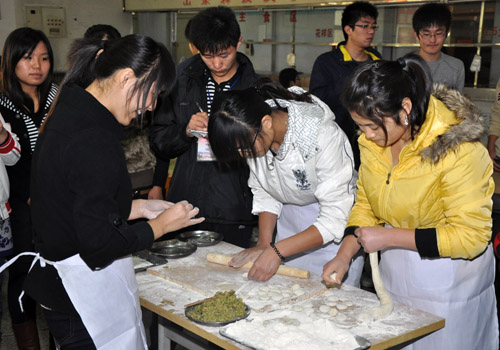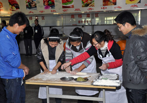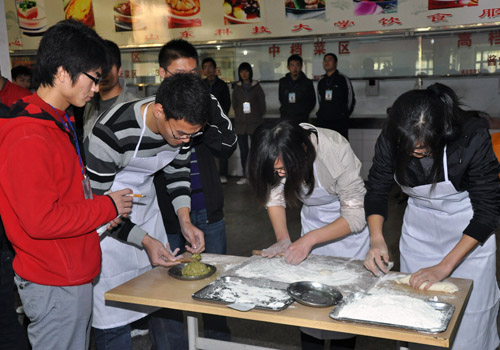 比赛分为九支队伍,每支队伍有五个小组,每小组由三位选手组成,每组选手须在5分钟的时间内包出尽可能多而美的饺子。比赛还没开始,同学们个个喜气洋洋,跃跃欲试,都希望在比赛中大显身手。随着主持人一声令下,参赛队伍们擀皮、放馅、捏饺子,选手们团结协作,争分夺秒,忙得不亦乐乎。现场观众的加油声、欢笑声和餐具的碰撞声交织成一曲欢快的交响乐……参赛同学们包饺子的招式各有千秋,熟练程度各有不同,有的专业得如一名行家里手,有的却略显笨拙,有的饺子充满创意,顷刻工夫,一个个鲜活的饺子就呈现在大家的眼前。