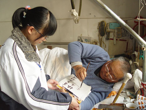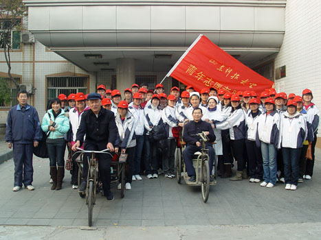 旗帜飞扬,青年志愿者协会受到院方领导的热情接待。短暂安排后,慰问活动便有条不紊地展开了。志愿者们陪老人聊天,听他们讲述老一辈人的革命故事、参军生涯;多才多艺的志愿者为老人弹吉他、唱军歌,同老人切磋棋艺,房间里一片其乐融融的景象。言谈中,志愿者纷纷被老人们顽强的意志、乐观的心态所折服和感动。“老人们钢铁般坚定的意志值得学习,此次活动让我感触良多,受益匪浅。”一位志愿者说。知识渊博、高位截瘫的孙景全老人亲笔为志愿者们写下寄语“及时当勉励,岁月不饶人”,字里行间闪烁着一位退役军人对当代学子的期盼和教诲。同时,志愿者们还积极地帮老人们整理房间、打扫卫生、提水,真诚地为老人献一份爱心,尽一份力。