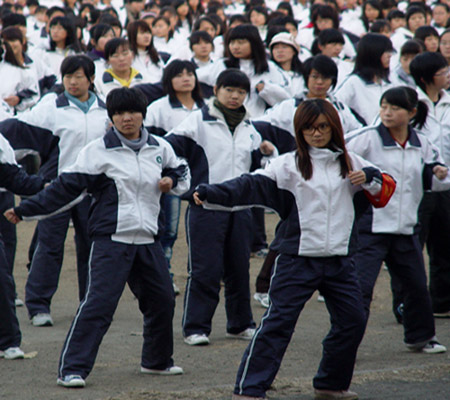 秋日的清早,寒风阵阵,凉意不断。在西校园操场上,10级全体新生顶着丝丝寒意,早早的来到操场。在校区(学院)自律会有关成员的安排下,他们出场有序、列队整齐,安静得等待着比赛的开始。随着音乐旋律的响起,同学们集体应拍而动,他们规范地伸臂、跳跃、弯腰、挥动四肢……动作娴熟、协调有力,节拍准确、极具韵律的美感。他们整齐一致的动作霎时间使整个操场变成了“一个人舞蹈”的海洋。在为期四天的比赛中,由校区(学院)自律会以及各系自律会负责人组成的评审团在各班队形整齐程度、动作规范程度以及纪律性等方面进行了总体考核评分,依据各班考核分计算各系的平均分。最终,文法系荣获“体育风采奖”、经管系和信息系分获“优秀组织奖”和“精神文明奖”。