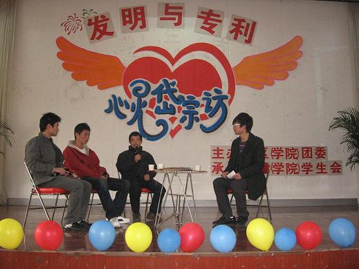 本次活动邀请到专利咨询服务中心曲来印教授、机电系大四纪鹏同学、大二郑志伟同学做嘉宾。曲来印教授从事申请代理20余年,为我校代理申请专利300余项,有着丰富的经验;纪鹏同学在校期间共获三项实用新型专利,其中一项获批发明专利;郑志伟同学在2009年下半年共获12项实用新型专利。