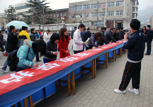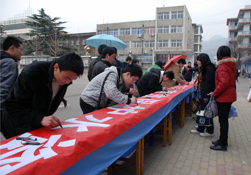 水——生命的源泉,这句大家耳熟能详的一句话,不断受到众多国家的焦点关注,而我国南方也正遭受五十三年来的罕见旱灾。在本次签名活动中,过往师生纷纷在条幅上签名,留下自己的美好祝愿,在他们坚实的笔迹中无不流露着节约用水的决心。同时,本次签名活动也吸引了小学生们的加入。据悉,本次活动亦引起校外媒体的关注,泰安电视台的记者们对在校大学生们进行了采访,同学们从不同角度阐述了水资源的宝贵及介绍了如何节水用水的小常识。