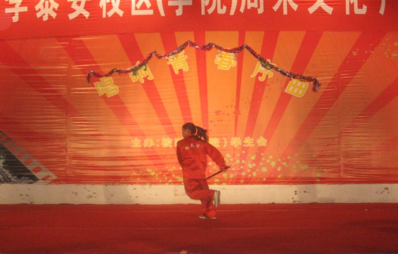 恰逢校区(学院)喜迎2009届新生的日子,为了继续推进周末文化广场的建设,使同学们的周末文化生活得到不断丰富,同时让09级新生充分感受当代大学生的蓬勃朝气、火热青春与动感活力,新学期首场晚会以《唱响青春序曲》为主题。晚会上优美动听的歌声让听众辗转回味;节奏强劲的现代舞让同学们激情飞扬;中国传统武术梅花桩让观众呐喊不断;灯光变换,旋律婉转,台上台下,群情激昂,共同融入了欢乐的海洋。