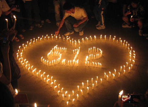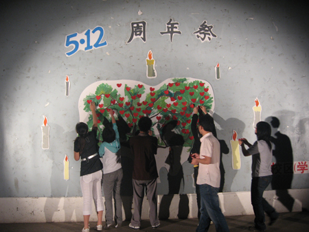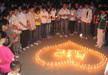 5月12日20时,校区(学院)周末文化广场早已聚满了前来参加纪念汶川地震一周年活动的同学。活动中同学手捧蜡烛,井然有序地点燃一根根蜡烛,点亮了“5.12”图案,围成心型。熠熠烛光下,所有同学虔诚地为汶川地震中遇难的同胞们默哀3分钟。烛光摇曳,凝聚了同学们对四川同胞的哀悼和祈福,大家一起祈祷,把最真诚的祝福送给灾区人民。随后同学们在自己做的心愿卡写上心愿与祝福悬挂在心愿树。数不清的心愿卡,寄寓着对遇难同胞的深切怀念之情,衷心地表达科大学子的祝福和希望。