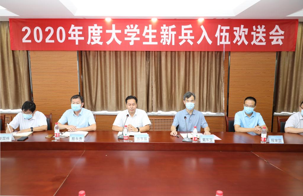 9月3日上午,校区召开2020年度大学生新兵入伍欢送会,校区管委副主任方亨福、学团工作部相关人员、各学院(部)党委副书记、学工办主任及13名在校入伍大学生参加,会议由学团工作部主任戴东宝主持。