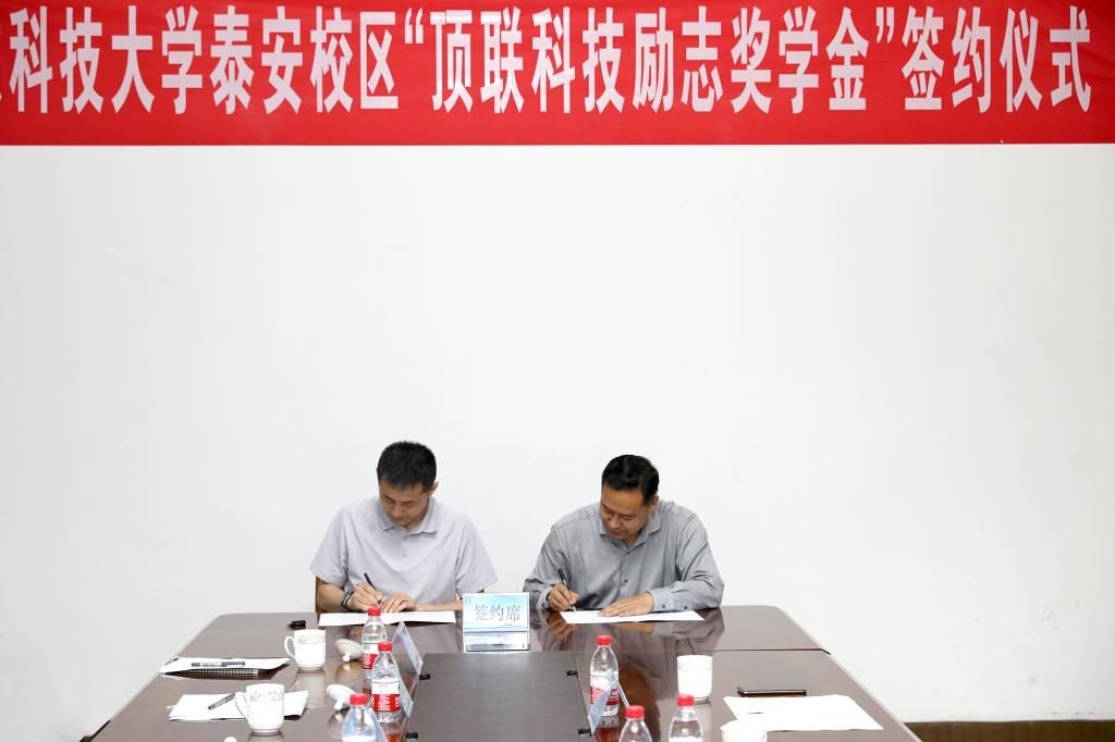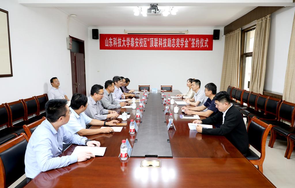 9月28日下午,校区在东校园201会议室举行“顶联科技励志奖学金”签约仪式。泰安校区管委副主任方亨福、山东顶联拓扑教育科技有限公司总经理王庆奎出席签约仪式。校区管委委员、学团工作部主任戴东宝主持签约仪式。