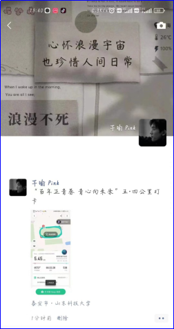 校区团委鼓励身体健康、热爱运动的广大青年学子积极参与到活动中来。连日来学生们通过进行跑步打卡,转发朋友圈配以文案“百年正青春,青心向未来,5.4公里打卡”的方式纪念五四运动。自活动开展以来,校区学子参与热情高涨,目前已收到打卡截图二百余张。