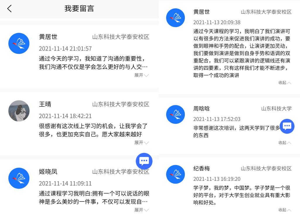 本期活动为期6天。校区200名家庭经济困难学生参加了《青春指南针》模块的学习和互动,课程包括《自信心提升与阳光心态》、《魅力表达》、《高效沟通力》、《人际交往力》、《情绪调节与压力管理》。人力资源和社会保障部授予的“中国百大好讲师”、济南电视台《我的正能量》专题主讲嘉宾郑奕老师,人力资源管理师、职业生涯规划师迮继明老师和国家认证职业核心能力培训师侯华玲老师对同学们开展线上课程并进行远程指导。线上课程分别从自信的法则、演讲要素、沟通对象、交友模板、缓解压力方法等方面为同学们进行了深入浅出、简洁高效的指导与梳理。同时执行团队建立班级学习群,“讲师+助教”在线指导和答疑,在有效提升在线学习的趣味性和互动性的同时,取得了很好的教学效果。此次活动中,同学们积极主动,认真参与,课程通过率达到98%。