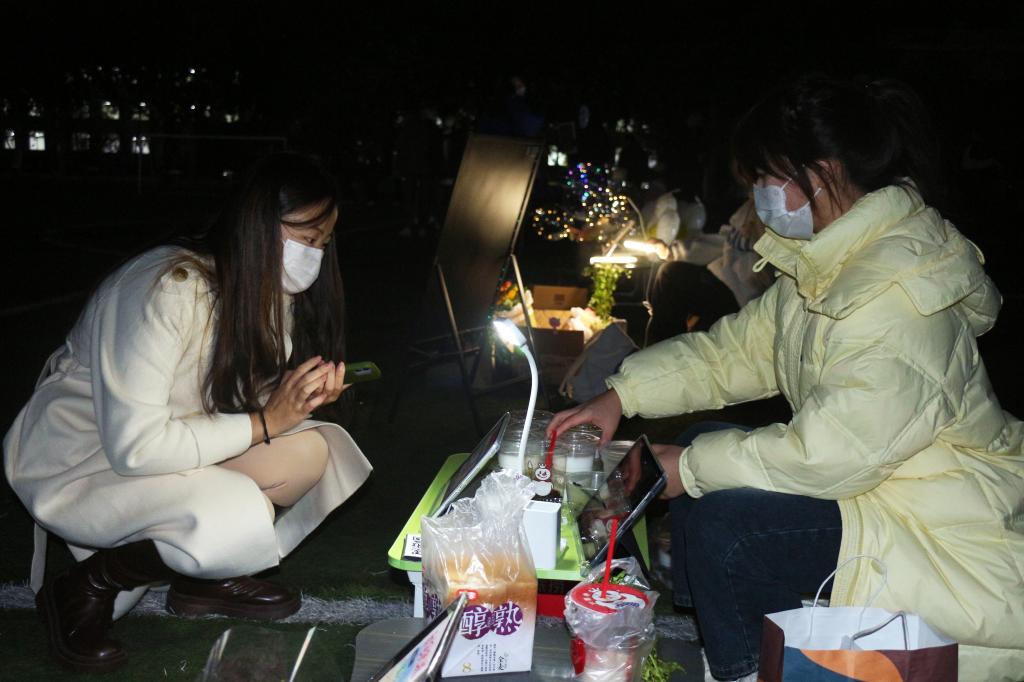 小夜灯,小裙子,辅导书......同学们叫卖的物品多种多样,丰富多彩;“同学过来看一看有没有心仪的商品?”“原价三十多块钱的灯,只花了我十块,真是太划算了!”买者与卖者也都沉浸在这热闹的氛围中。逐渐转凉的天气也无法削减同学们对跳蚤市场的无限热情,成群结队的人依旧活跃在夜色已至的跳蚤市场中。