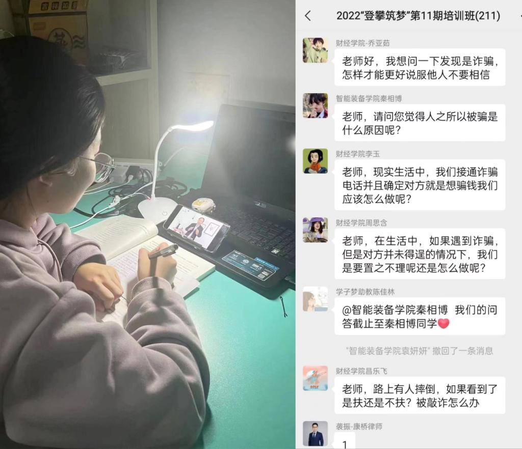 校区2022级200名家庭经济困难学生参加本期活动。本期活动主题为“筑牢诚信安全线,铸就责任感恩心”,包括《诚信为德本》《感恩与责任》《反诈那些事儿》等课程。各专题老师对同学们开展线上课程并进行远程指导,帮助同学们在传统文化中理解“不患无位,患所以立”;指导学生如何感恩国家、学校、父母,明白责任担当的内涵;了解网络上的种种诈骗行为,提高安全防范意识,提升反诈能力。线上课程为同学们进行了深入浅出、简洁高效的指导与梳理。同时执行团队建立班级学习群,“讲师+助教”在线指导和答疑,在有效提升在线学习的趣味性和互动性的同时,取得了很好的教学效果。同学们积极主动,认真参与,课程通过率达到99.5%。经过此次培训,同学们纷纷表示悟到了诚信待人,懂得了感恩奉献,增长了反诈知识。