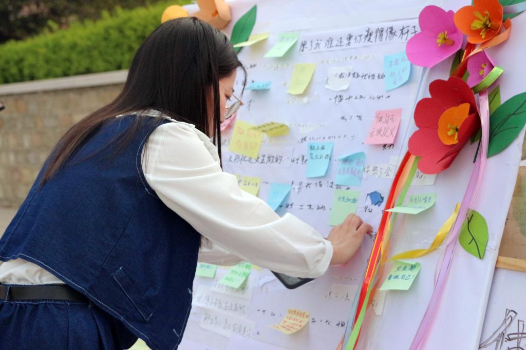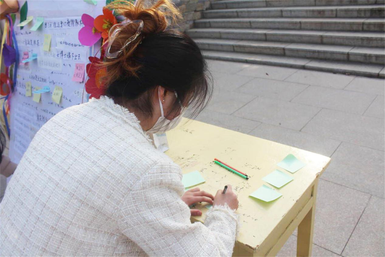 活动分为线上和线下两部分依次开展,线上通过心灵小憩公众号征集社会对女性的标签或鼓励话语,线下通过展板展出社会对女性的刻板印象,鼓励参加活动的同学撕掉展板上的刻板标签或留下对女性鼓励的话语。活动进行过程中,同学们认真看着贴满定义标签的展板,他们用力撕下展板上对女生定义的标签,并在便利贴上留下作为女生的心声或是对女生鼓励的话。一个个标签被撕掉,打破了外界对女生的偏见、束缚和刻板印象,整个过程充满了温暖与爱。