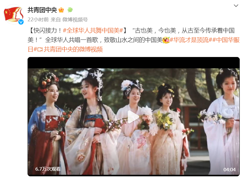 为深入贯彻落实习近平总书记推动中华优秀传统文化创造性转化、创新性发展的重要指示精神,共青团中央于近日举办第五届“中国华服日”全球快闪活动,校区汉服文化节相关视频素材被采用并在共青团中央微博、微信视频号等多家媒体平台播放展示。