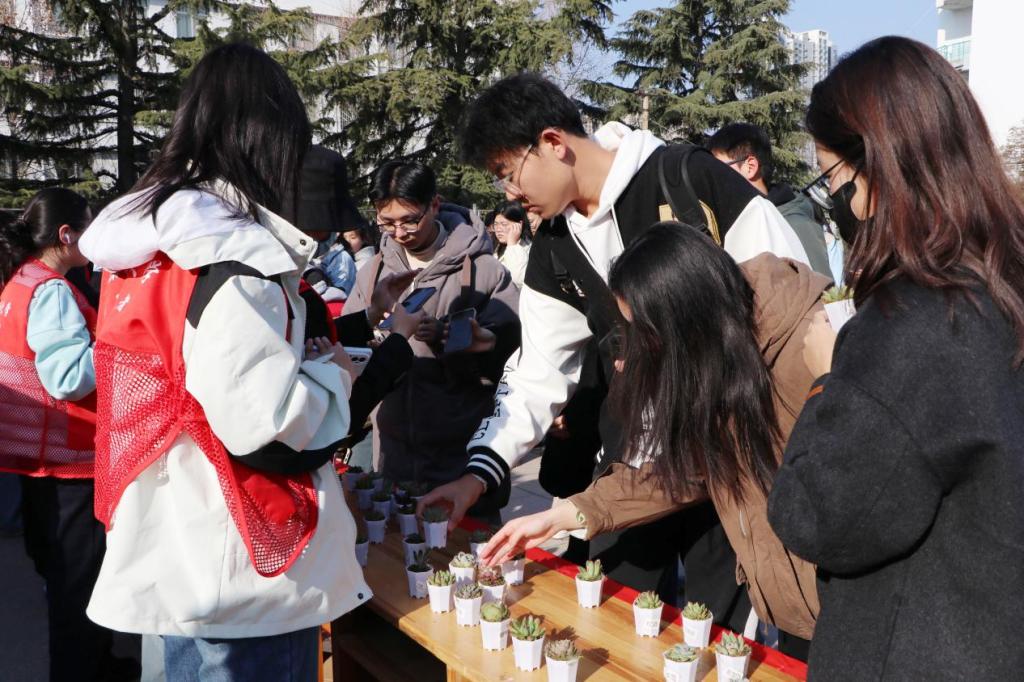 活动现场,同学们以写便利贴的方式为生态校园“发声”,每位参加活动同学均可免费领取一盆多肉植物。 “让我们一起为地球种一棵树!”“保护环境,从点滴做起。”“希望每个人都能爱护我们的校园!”小小的卡片,温馨的话语,表达了同学们对环保的关注和热爱,也让更多的人了解到植树节的重要意义。