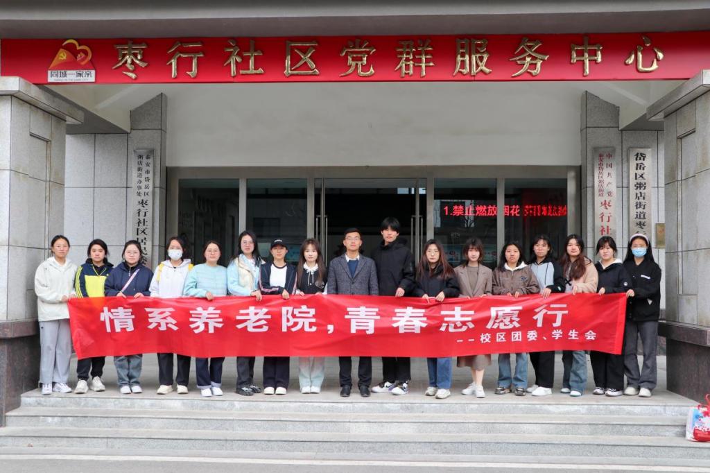为弘扬中华民族“尊老、敬老、爱老、助老”的传统美德,丰富老年人的精神生活,3月24日,校区团委组织校区学生会、岱嵙志愿服务团队师生代表前往泰山养老中心开展“情系养老院 青春志愿行”志愿服务活动。