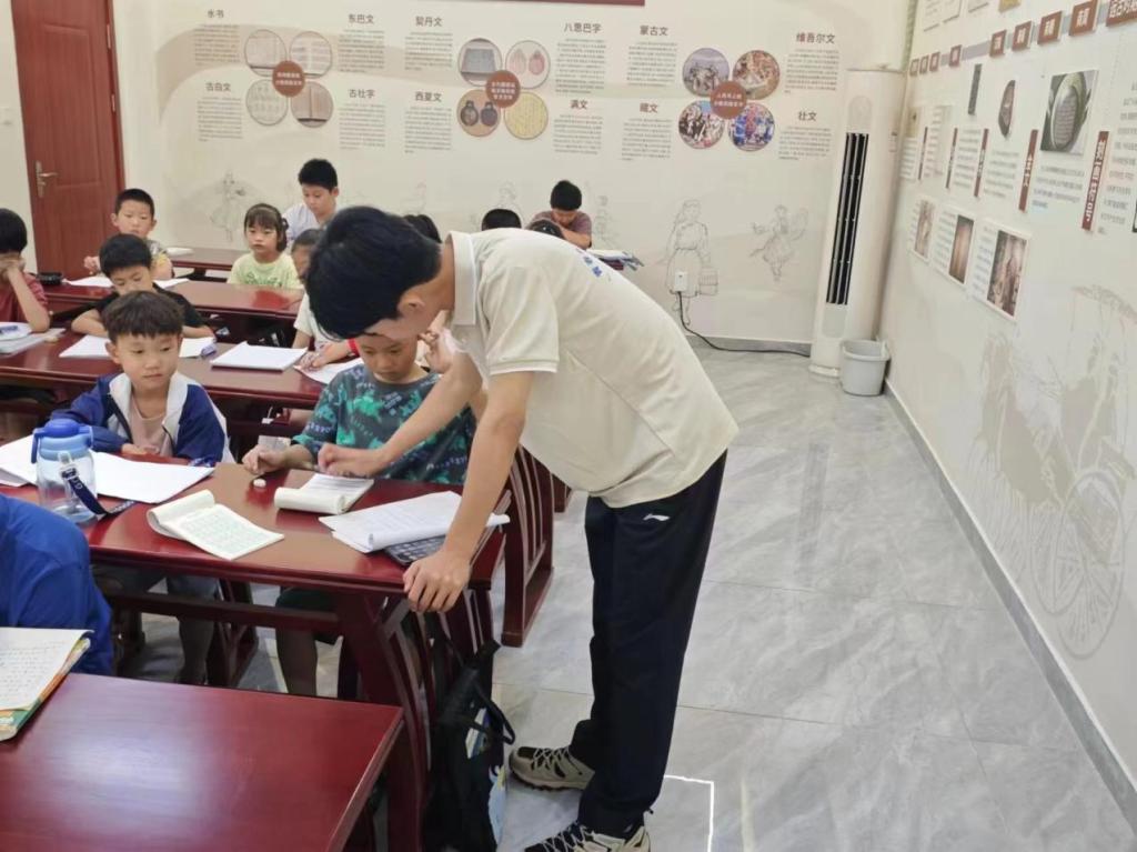田耘硕:在本周工作中,我主要负责在村委会开办的红石榴学堂参与留守儿童关爱及学业辅导,协助学堂活动开展,如:青少年关心关爱、书籍借阅记录及管理等。通过对村内不同年龄段留守青少年进行心理呵护、学业辅导和协助看管,解决“学生放暑假,家长不在家”的难题,以实际行动为驻地青少年奉献爱心、为校地融合做出青春贡献。