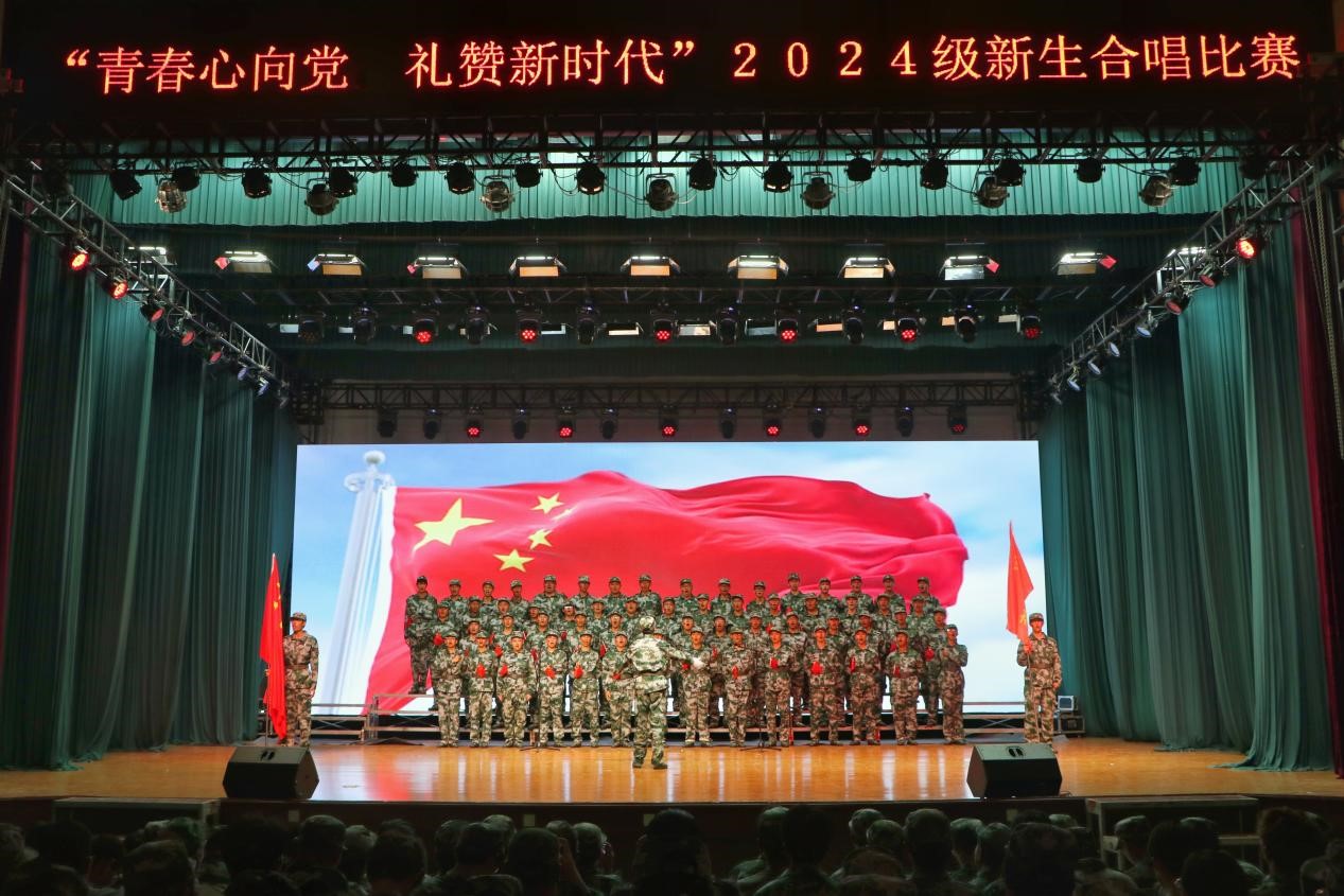 “我和我的祖国,一刻也不能分割……”新生们用深情的歌声、饱满的热情,表达出对祖国75岁生日的诚挚祝福。各连队除指定曲目《歌唱祖国》《我和我的祖国》外,还有自选曲目《没有共产党就没有新中国》《祝福祖国》《强军战歌》等经典红色歌曲。各连队赛前精心制作LED背景视频,赛中别出心裁的将舞狮、军体拳、舞蹈和擂鼓等多种形式融入合唱,令人耳目一新,赢得台下阵阵掌声。2024级新生以激昂的旋律奏响青春乐章,用一首首红色赞歌向祖国告白,展现了新时代青年永远跟党走的豪迈决心,唱出了青年学子们对伟大祖国无限赞美。经过一番激烈角逐,二连凭借扎实的唱功和精彩的舞台表演荣获一等奖,十一连、十连获得二等奖,三连、七连、十四连获得三等奖,穆文悦、崔家瑞同学获得最佳指挥奖。