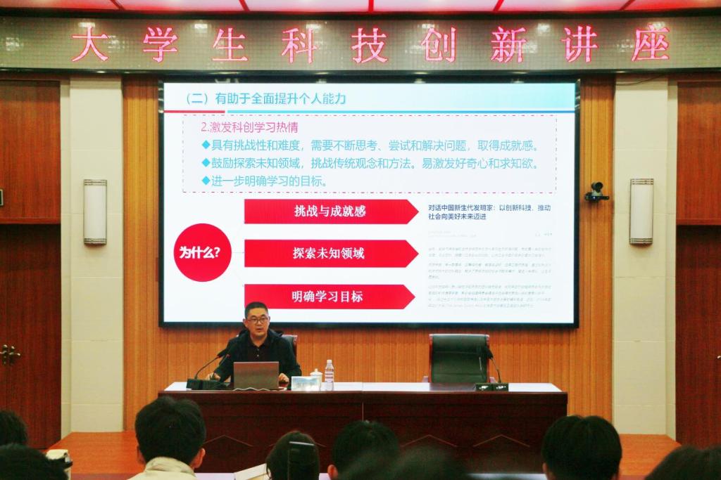 秦广鹏以“探索科技前沿,共筑梦想基石”为主题,主要从大学生科技创新的重要性、为什么要参加、如何参加等方面进行了深入讲解。授课过程中,秦广鹏结合当前科技创新实际和具体案例,生动形象地与大家分享了科技创新的成功经验和创新做法。通过讲述一个个鲜活的科技创新故事,让同学们深刻感受到了科技创新的魅力和力量。同时,秦广鹏深入剖析了当前科技创新面临的机遇与挑战。他指出,随着科技的飞速发展,科技创新迎来了前所未有的机遇,同时也面临着诸多挑战,大学生要敢于迎接挑战,抓住机遇,在科技创新的道路上不断前行。