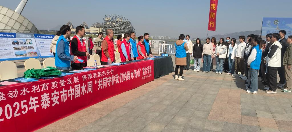 3月22日,泰安市在天平湖公园广场举办2025年“世界水日”暨“中国水周”节水宣传月启动仪式。泰安校区作为驻泰高校代表受邀参加,各学院师生代表、校区“青马工程”岱嵙班及校区团中央系列团队成员代表共三十余名师生现场参加节水宣传志愿活动,用青春行动践行绿色节水的环保生态理念。