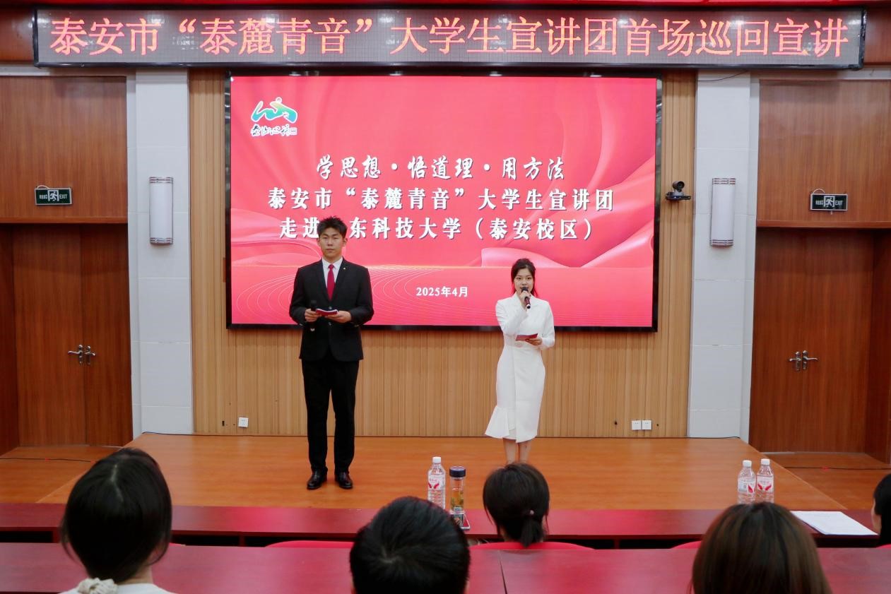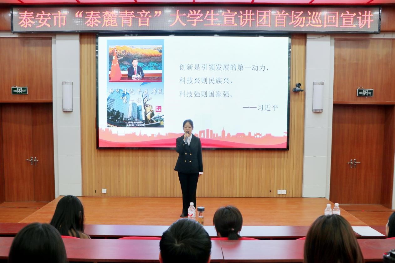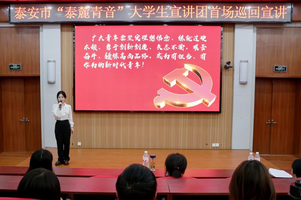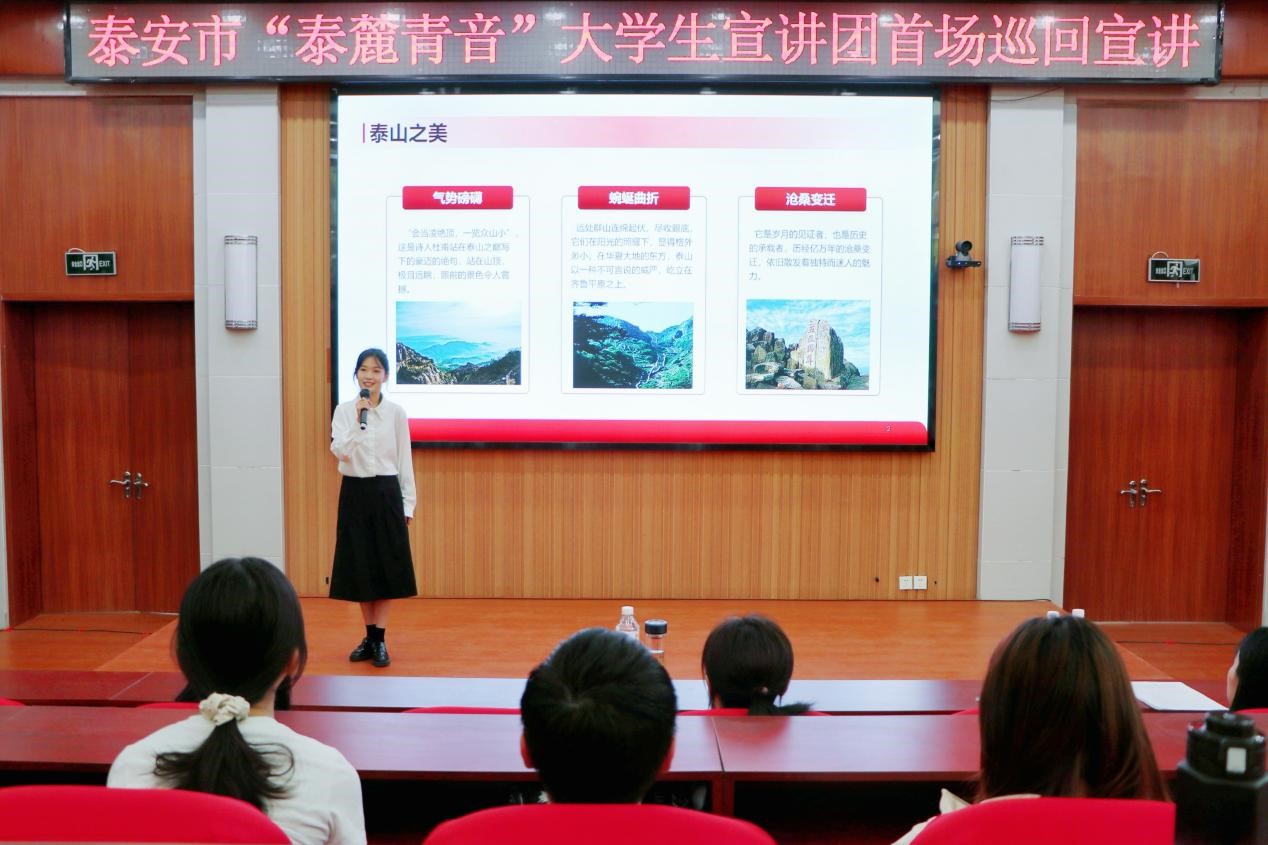 “泰麓青音”大学生宣讲团由泰安市委宣传部联合市委教育工委、团市委共同组建,旨在以青春之声传播时代强音,首站活动后将在驻泰高校展开系列巡回宣讲。这场思想盛宴既是理论武装的"播种机",更是校际、校地协同的"强纽带"。通过"宣讲大篷车"的流动传播,不仅让"学思想、悟道理、用方法"在校园沃土扎根,更是构建起校地、校际思想共同体,激励青年学子以知行合一的青春答卷投身强国复兴伟业。