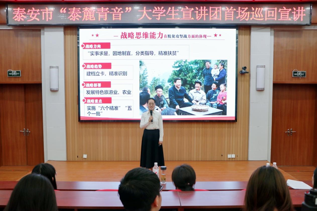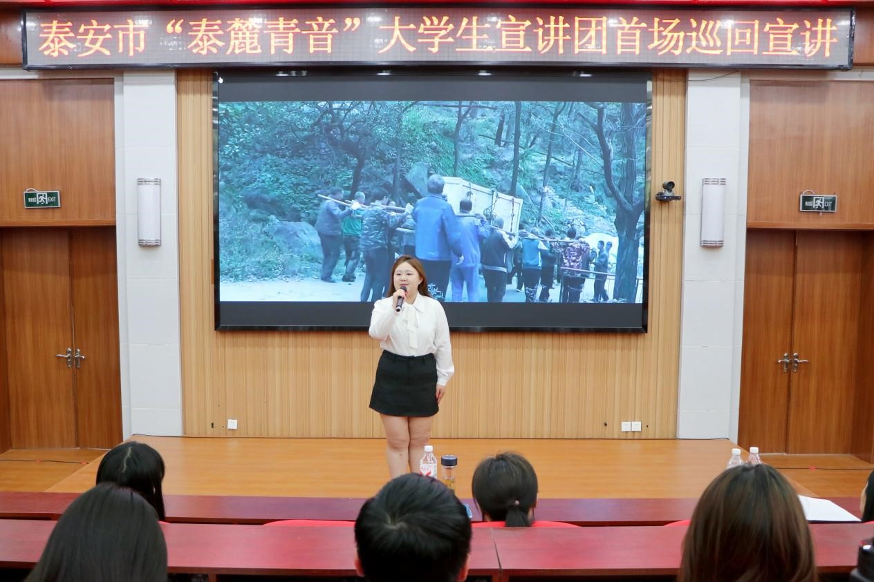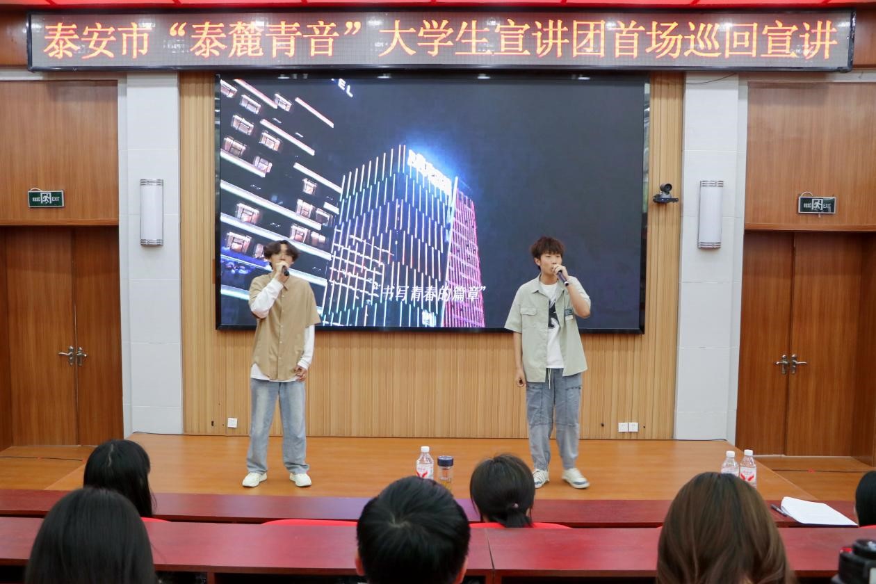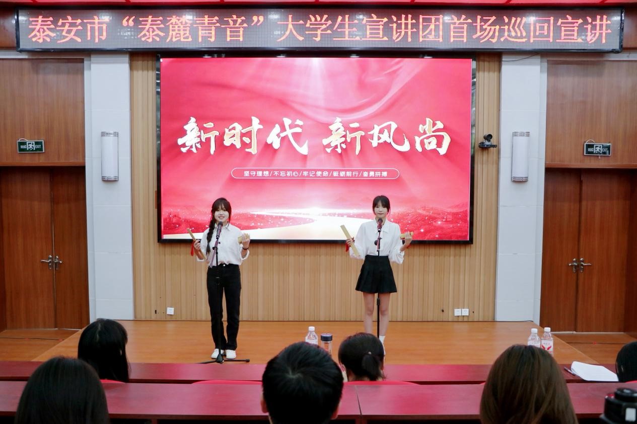 “泰麓青音”大学生宣讲团由泰安市委宣传部联合市委教育工委、团市委共同组建,旨在以青春之声传播时代强音,首站活动后将在驻泰高校展开系列巡回宣讲。这场思想盛宴既是理论武装的"播种机",更是校际、校地协同的"强纽带"。通过"宣讲大篷车"的流动传播,不仅让"学思想、悟道理、用方法"在校园沃土扎根,更是构建起校地、校际思想共同体,激励青年学子以知行合一的青春答卷投身强国复兴伟业。